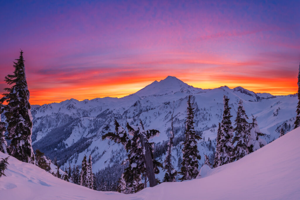 Winter near Mount Baker is a photographer’s paradise—think frozen lakes, alpenglow sunsets, and snow-covered peaks.
