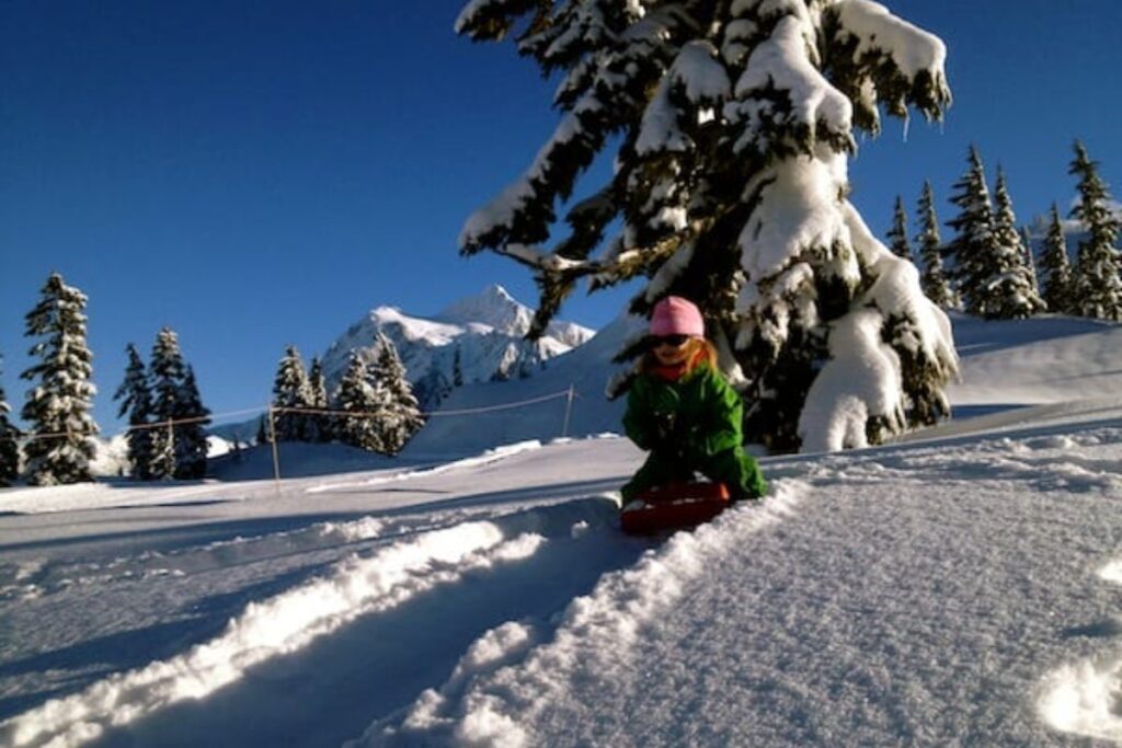 If you’re planning a family-friendly winter day, the Heather Meadows area is your best bet for sledding and snow play.