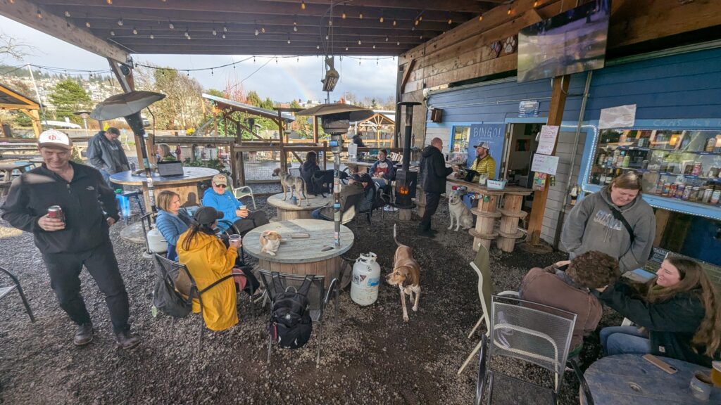 Located in Fairhaven, Stones Throw welcomes dogs on both front and back patios. The outdoor setting, built from shipping containers, creates a laid-back, community-focused vibe. Live music, rotating food carts, and proximity to the Interurban Trail make this a perfect post-adventure stop.